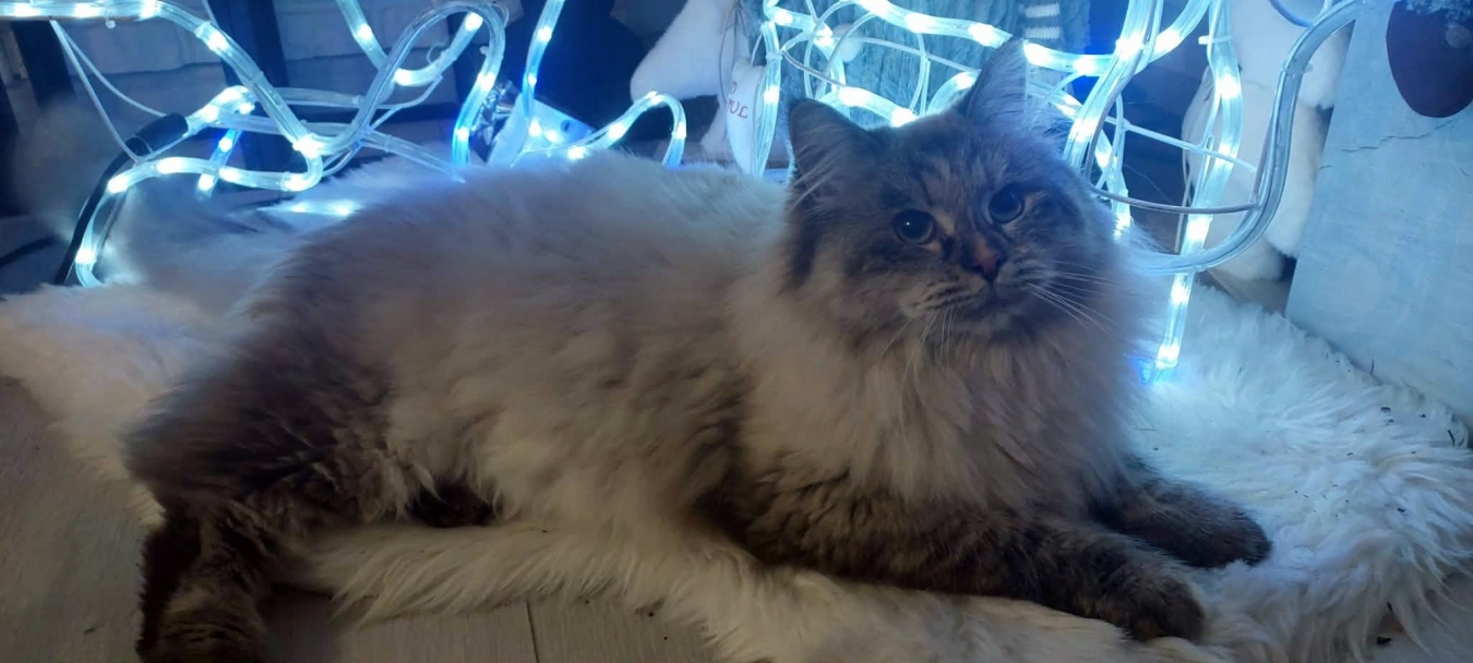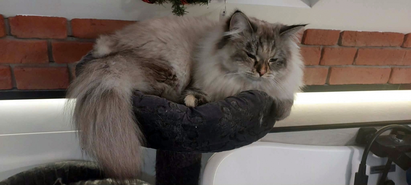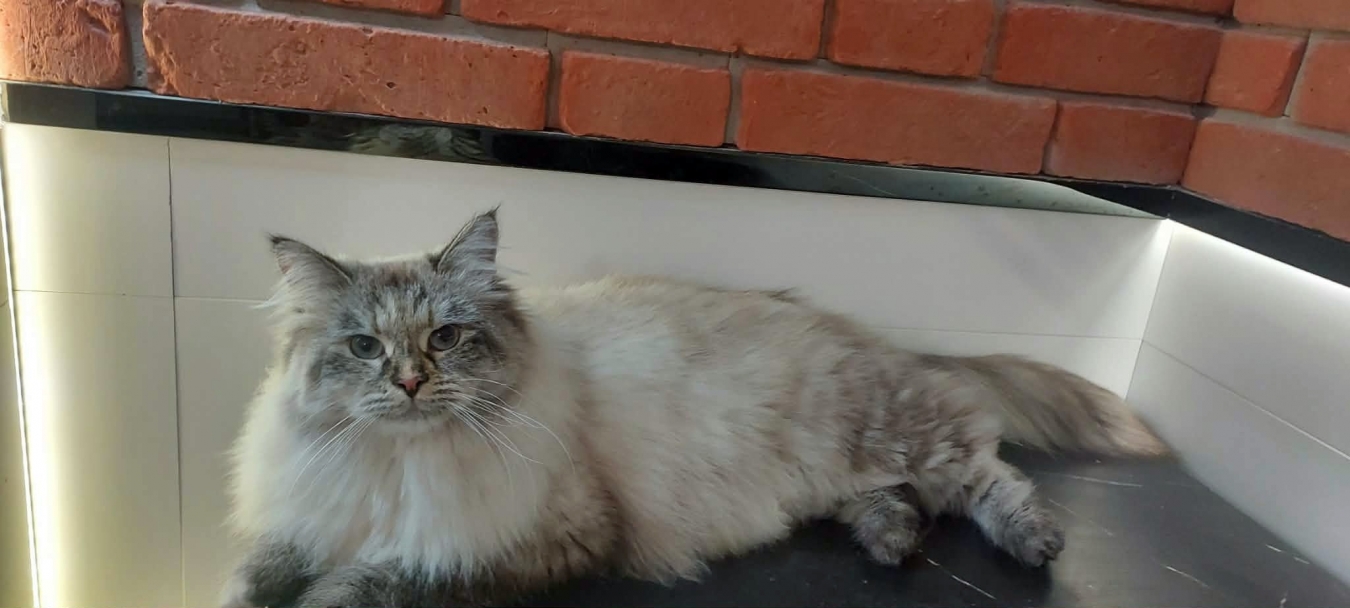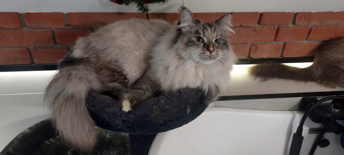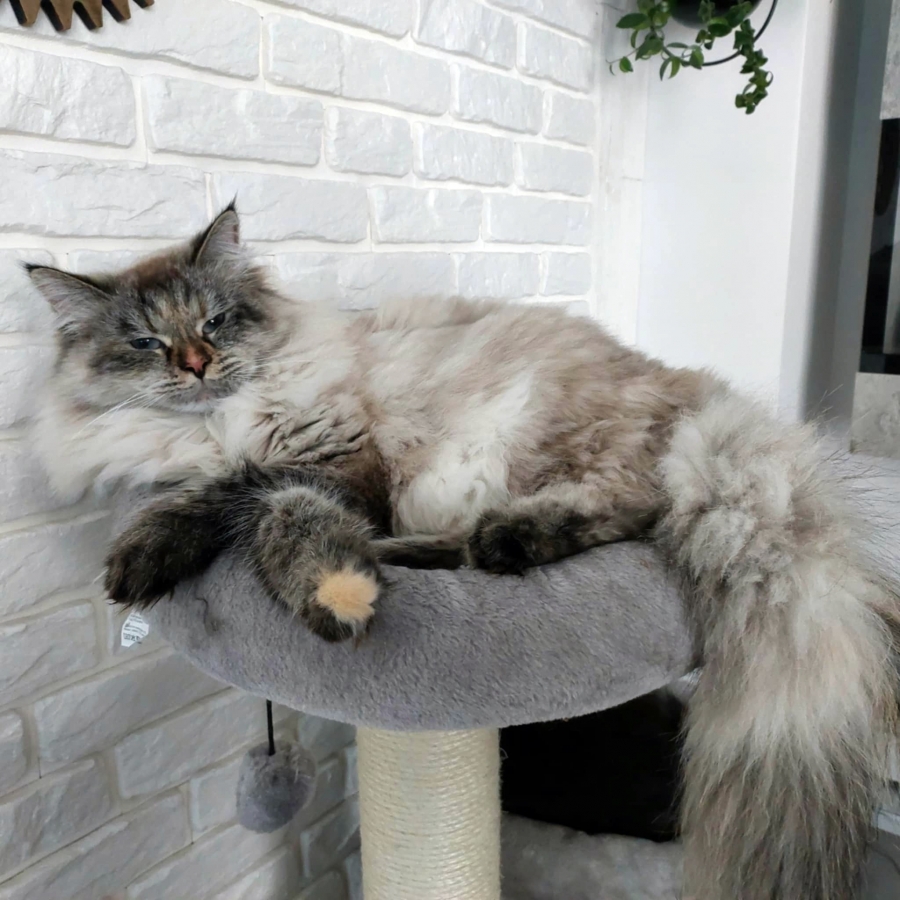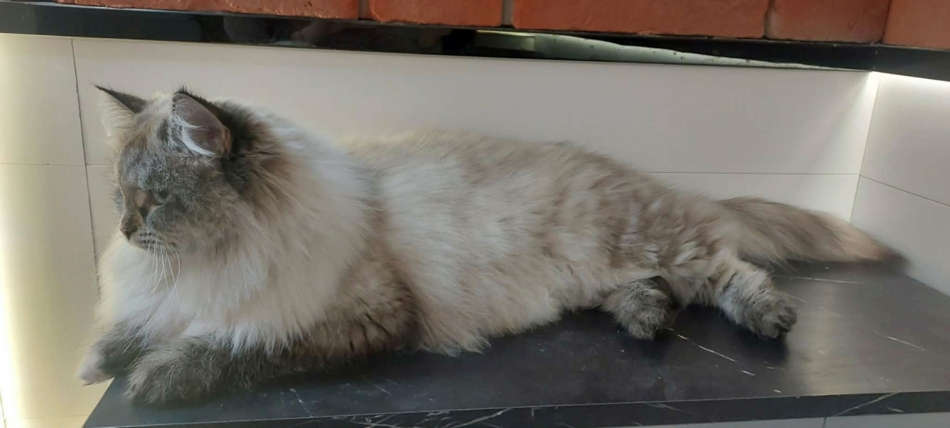 Brenda is a big female with a strong boned body. When in full coat, she looks like a small bear.She is very friendly for people and she likes to be petted. But very dominant to other cats.She reacts to human sneezing with meowing :)