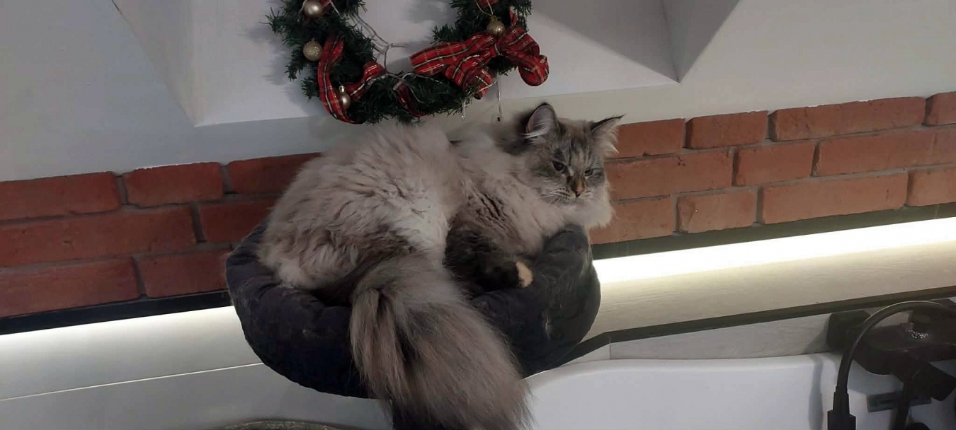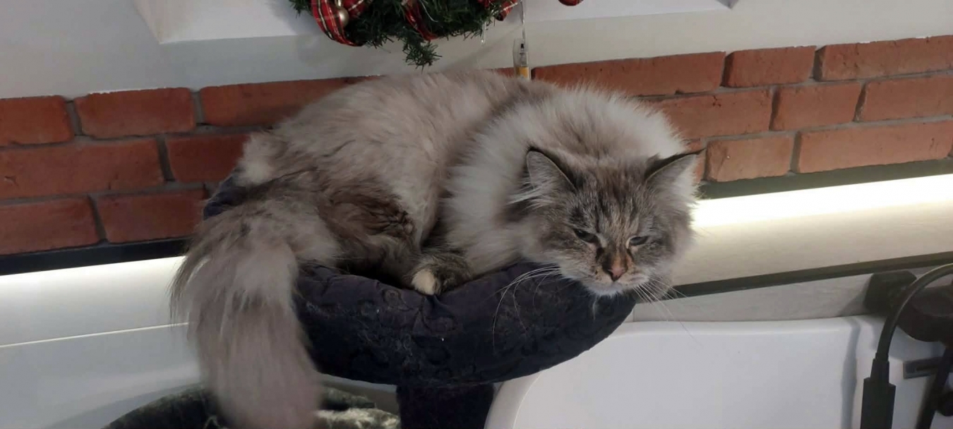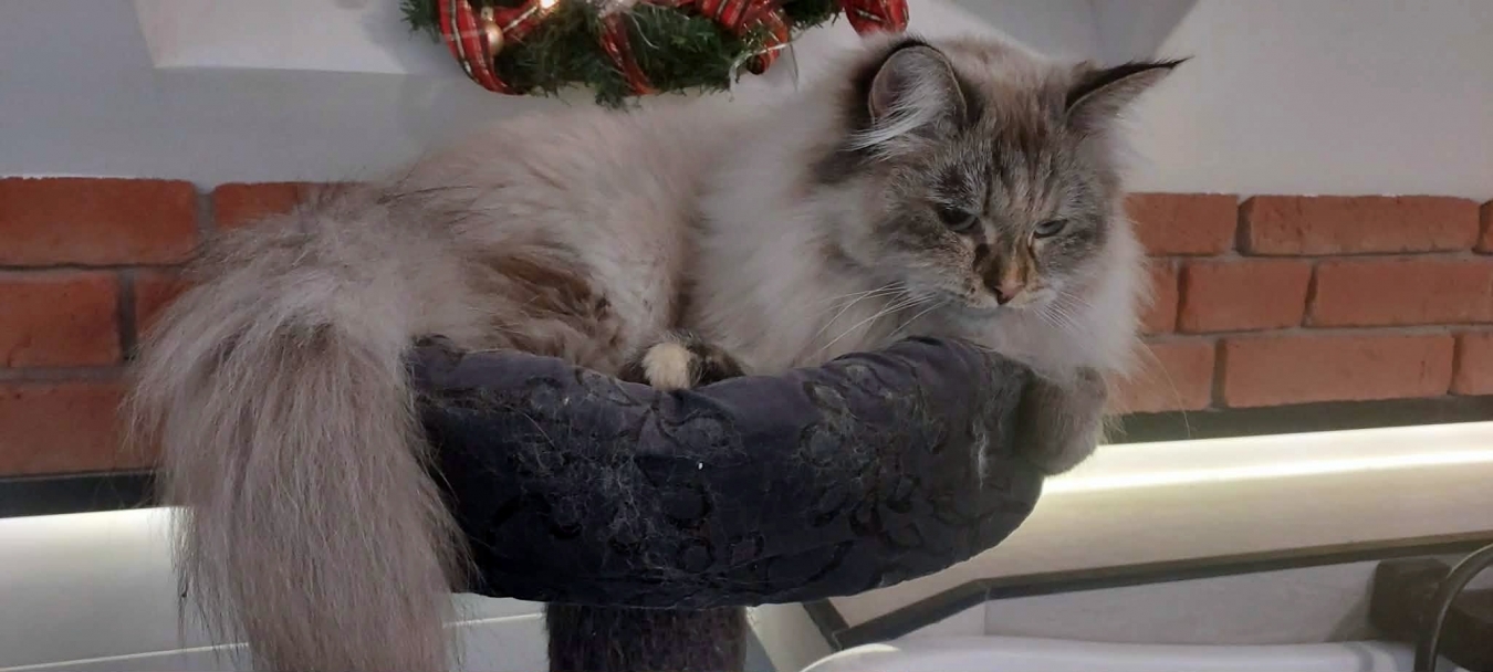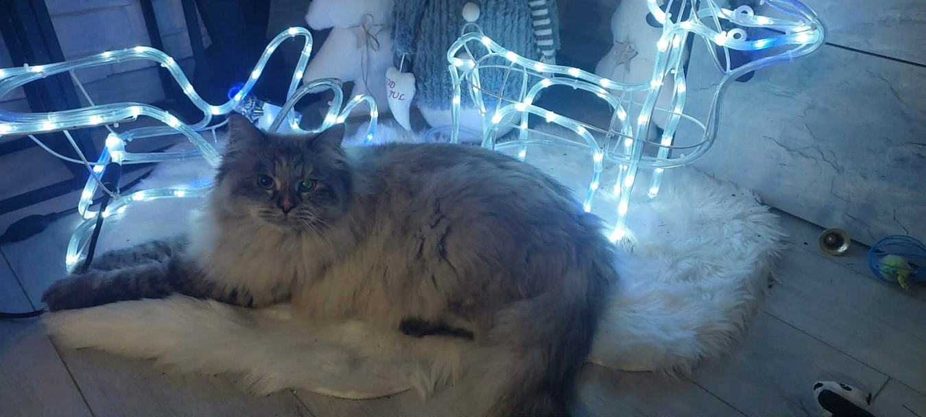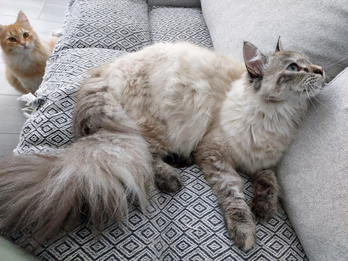 Brenda is a big female with a strong boned body. When in full coat, she looks like a small bear.She is very friendly for people and she likes to be petted. But very dominant to other cats.She reacts to human sneezing with meowing :)