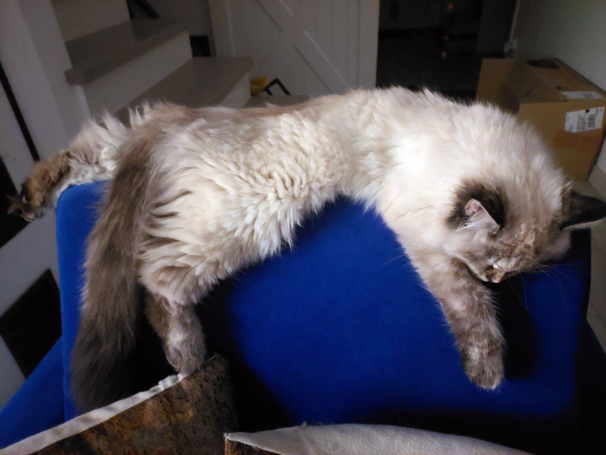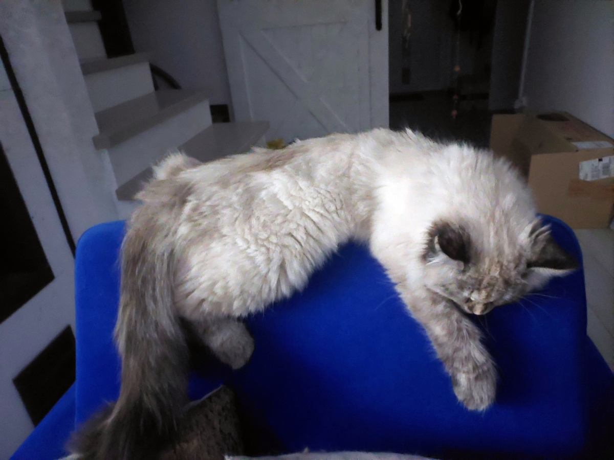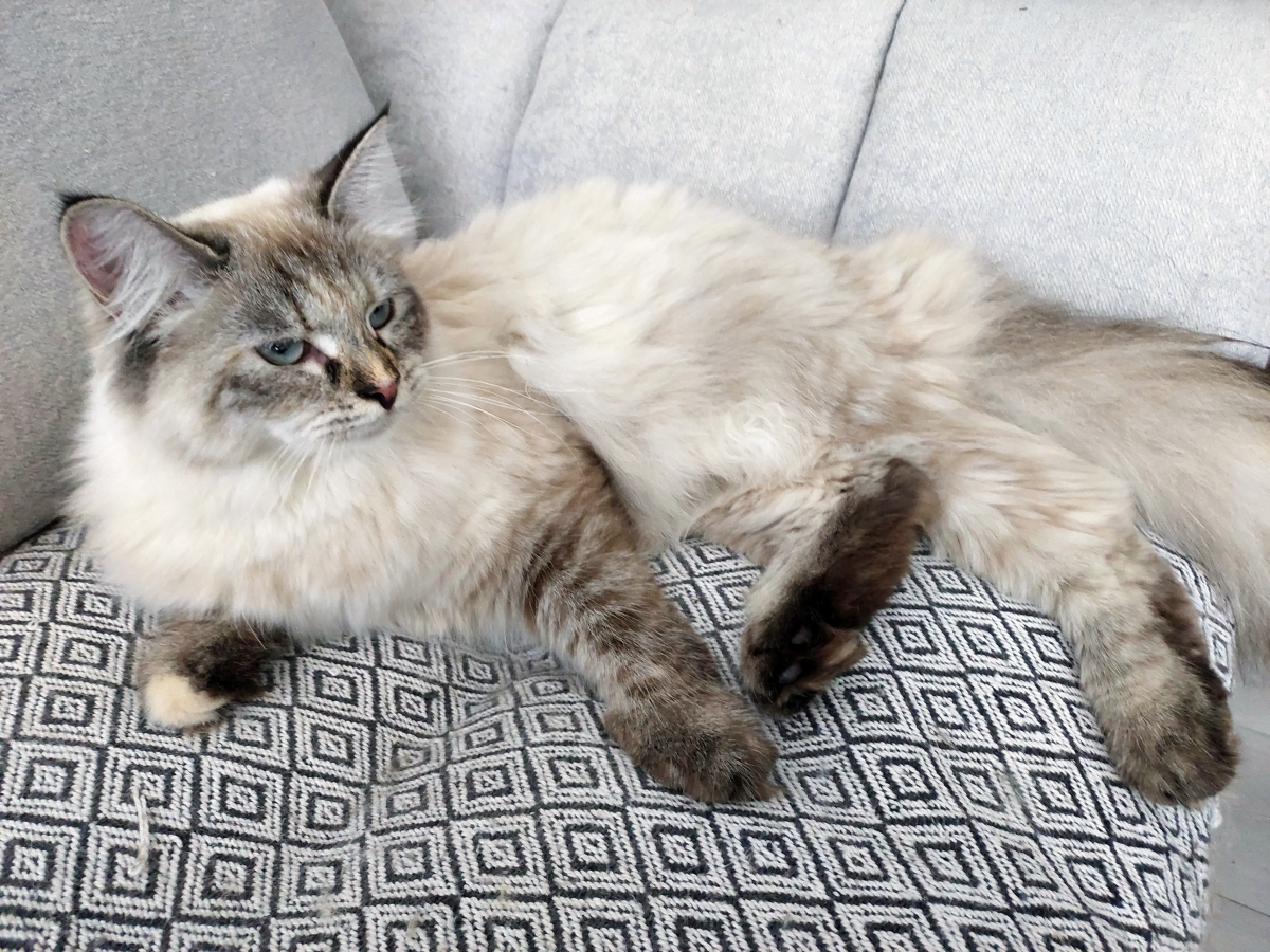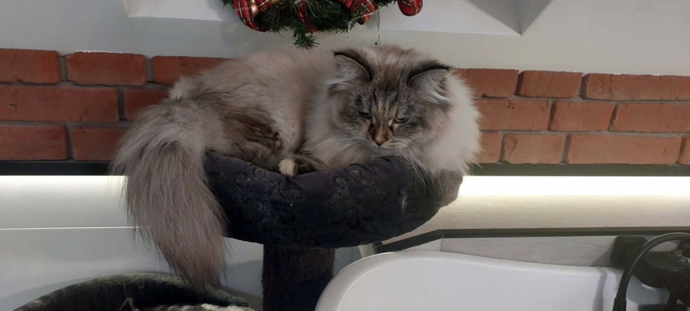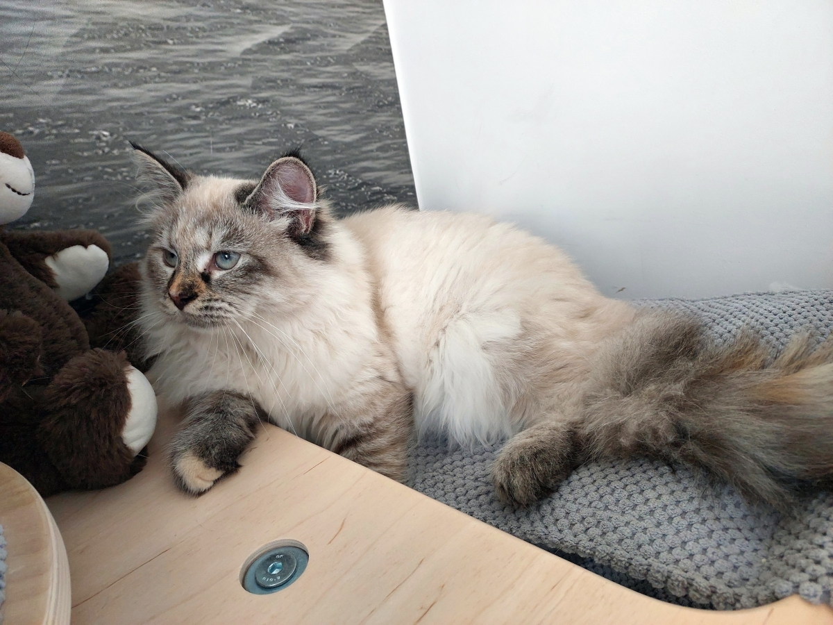 Brenda is a big female with a strong boned body. When in full coat, she looks like a small bear.She is very friendly for people and she likes to be petted. But very dominant to other cats.She reacts to human sneezing with meowing :)