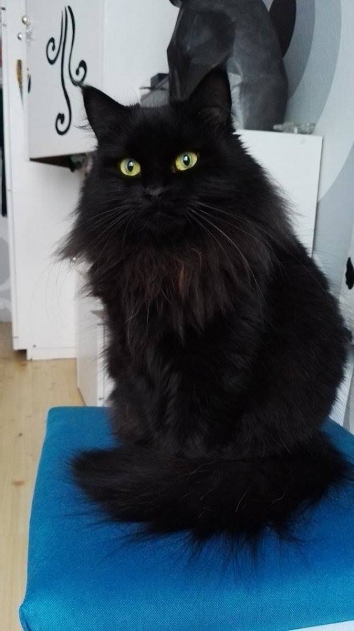 Grappa is a wonderful cat. Big, muscular, with shiny black fur and rounded head is very good in type.She's got great personality.She likes stroking and sitting on our laps.In addition, she enjoys giving her belly for pampering.She asks for taking her on hands by climbing our legs.As a typical female , she has her phobias, too.She doesn't like vets, so during his visit she always hides in the furthest corner of the flat.She also found her way to survive cat shows - by sitting under the bottom cover.Grappa is a fantastic mother and gives births to healthy and beautiful kittens.
